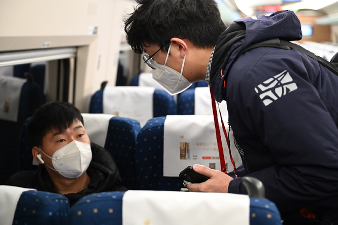 同車的孫先生則要趕往石家莊。在鐵路部門工作的他為了支援春運工作起了個大早,剛接受完記者采訪就閉上眼睛休息了起來。“這次疫情防控政策優(yōu)化調(diào)整后,好多人都選擇回家過年,希望我的工作可以幫助到大家?!睂O先生說。