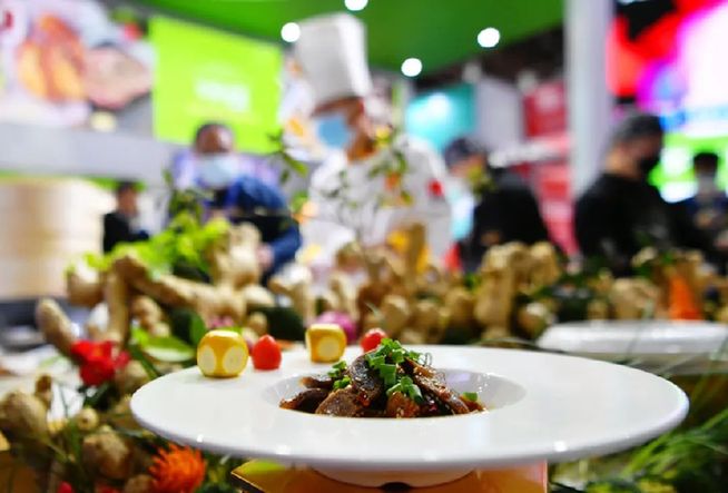 2021年12月2日,在2021中國預制菜產(chǎn)業(yè)大會暨展會現(xiàn)場,參展商展示一盤快熟菜品。新華社發(fā)