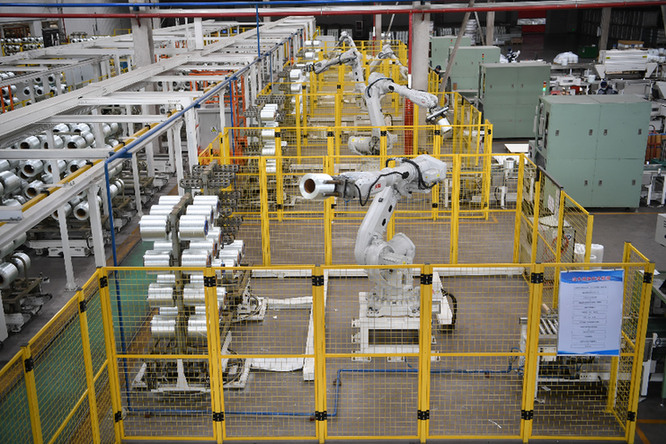 機械手臂在沙河市一家玻璃制品生產(chǎn)企業(yè)的生產(chǎn)線上工作。 新華社記者 牟宇 攝
