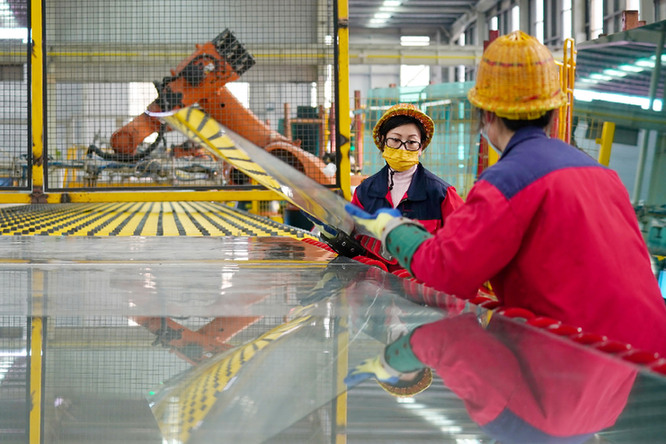 沙河市一家玻璃生產(chǎn)企業(yè)的工人在搬運玻璃產(chǎn)品。新華社記者 牟宇 攝