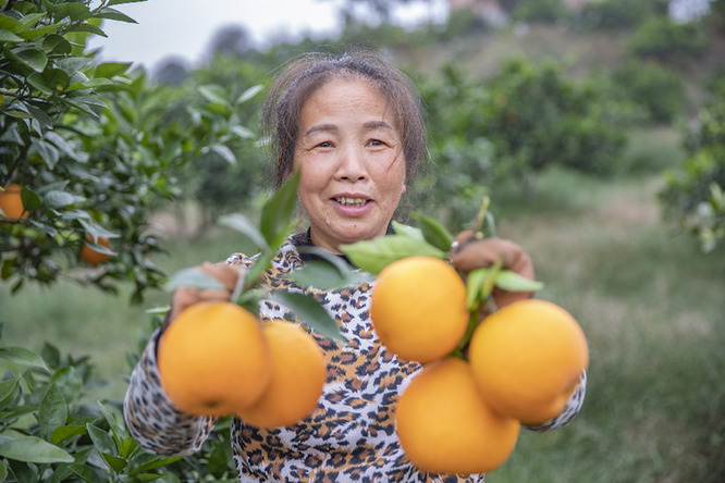 近日,在重慶市璧山區(qū)廣普鎮(zhèn)坪中村,一位村民在果園內展示自己采摘的臍橙。? 新華社記者 黃偉 攝