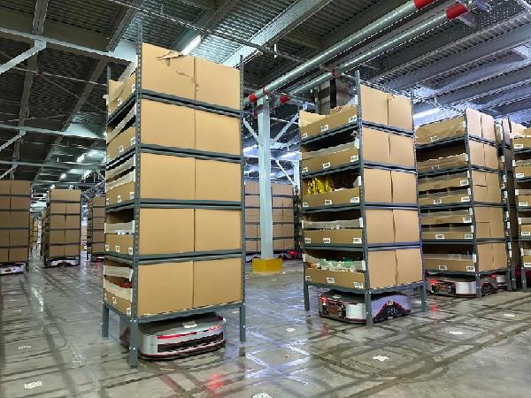 京東物流“地狼”智能機器人正在搬運貨架。(新華社記者陳碧琪 攝)