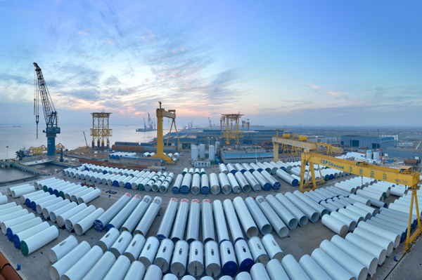 等待交付的海上風(fēng)電場風(fēng)機塔筒(2月7日攝,無人機照片)。