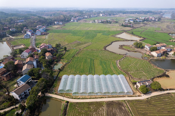 這是2月21日在醴陵市沈潭鎮(zhèn)江田村拍攝的一處新修建的育秧大棚(無人機照片)。