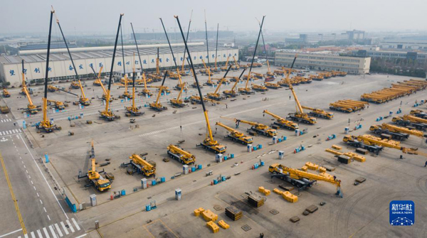 這是2019年4月4日在徐工集團(tuán)徐州重型機(jī)械有限公司拍攝的調(diào)試中的起重機(jī)(無人機(jī)拍攝)。新華社記者 李響 攝