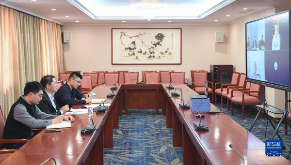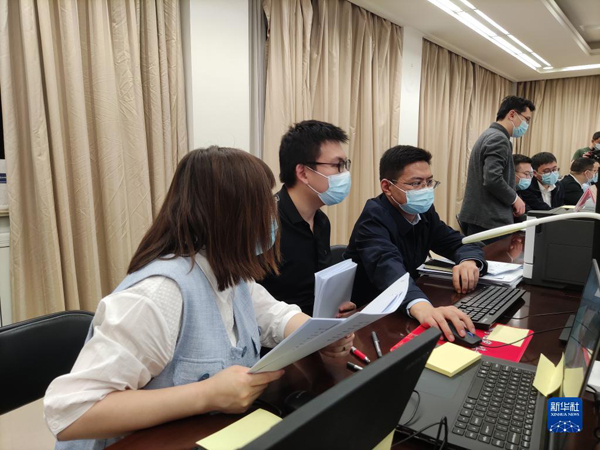 3月8日,科技部成果轉(zhuǎn)化與區(qū)域創(chuàng)新司二級巡視員陳宏生(左二)和他的兩位同事在科技部與全國政協(xié)委員汪鵬飛、隆克平視頻連線。新華社記者 戴天放 攝
