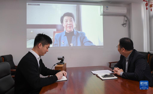 3月8日,全國人大代表、山西省昔陽縣大寨鎮(zhèn)大寨村黨總支書記郭鳳蓮在駐地與農(nóng)業(yè)農(nóng)村部工作人員視頻連線。新華社記者 胡喆 攝