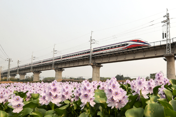 4月13日,從老撾萬象站駛出的D888次“瀾滄號(hào)”列車行駛在云南省西雙版納州境內(nèi)的中老鐵路橄欖壩特大橋上。