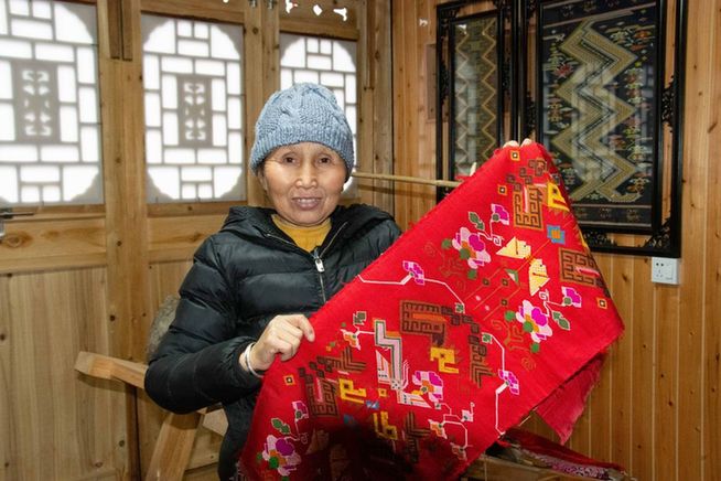 2022年1月7日,土家織錦國家級非遺傳承人劉代娥在湖南省龍山縣苗兒灘鎮(zhèn)撈車村展示自己做的土家織錦。新華社記者 柳王敏 攝