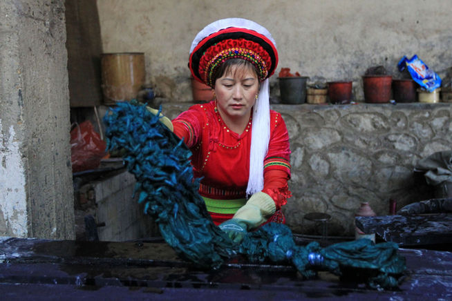 蒼山腳下、洱海之畔,綠樹紅花競相開放。在云南省大理市喜洲鎮(zhèn)周城村,青瓦白墻的璞真扎染博物館內(nèi),一位位白族村民的手下,藍(lán)白交織的白族扎染正在如花綻放。