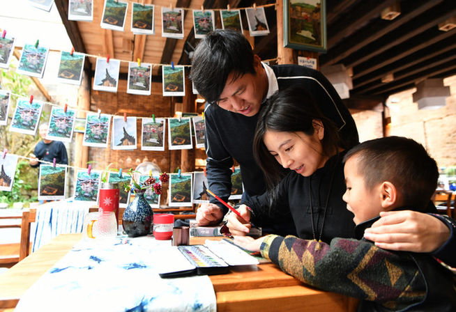 來自江西省吉安市的胡文亮是福建省寧德市屏南縣龍?zhí)洞逡M(jìn)的文創(chuàng)和專業(yè)設(shè)計(jì)人才。2020年5月,他投資六十多萬元翻新改造的兼具酒館、民宿和陶藝等功能的文創(chuàng)空間正式開業(yè)?!笆弧秉S金周期間接待游客近800人次。這是胡文亮(左一)和愛人曾婉珍(中)、小孩一起在繪制龍?zhí)洞逯黝}明信片(2020年10月21日攝)。新華社記者 魏培全 攝