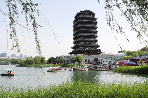 5月2日,游人在山東淄博齊盛湖泛舟游玩?!拔逡弧毙¢L假期間,人們來到各地景區(qū)游玩,樂享假期。新華社發(fā)(張進剛 攝)