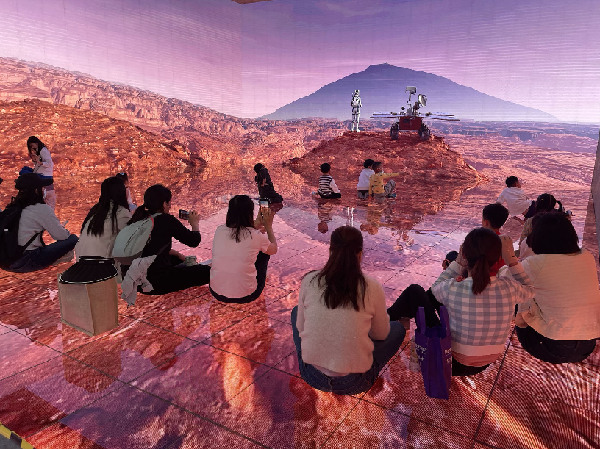 2023年“中國(guó)航天日”系列展覽上,參展者通過(guò)體驗(yàn)沉浸式航天元宇宙感受“登陸”火星。