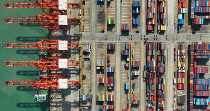 五月九日,在江蘇連云港港集裝箱碼頭,貨輪進(jìn)行集裝箱裝卸作業(yè)(無(wú)人機(jī)照片)。新華社發(fā)(耿玉和 攝)