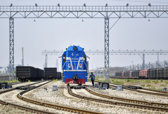 5月11日,在新疆霍爾果斯鐵路口岸,工作人員在駝峰場(chǎng)檢查火車頭。