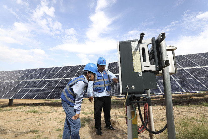 國家電投五凌電力余丁光伏電站職工在檢修設(shè)備。新華社記者 盧鷹 攝