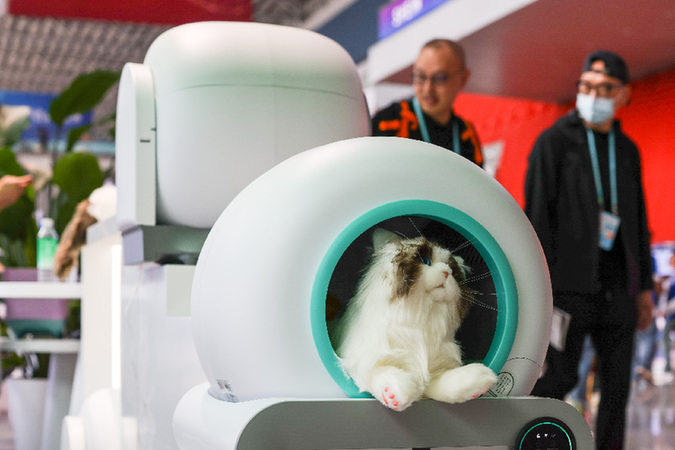 一家中國工業(yè)設(shè)計(jì)企業(yè)在第133屆廣交會(huì)上展示的全自動(dòng)貓砂盆等寵物電器。新華社記者 劉大偉 攝