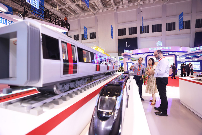 6月17日,2023中國·廊坊國際經(jīng)濟(jì)貿(mào)易洽談會開幕。圖為賓客在臨空國際會展中心中國式現(xiàn)代化建設(shè)河北篇章主體形象展展館參觀。賈珺 攝
