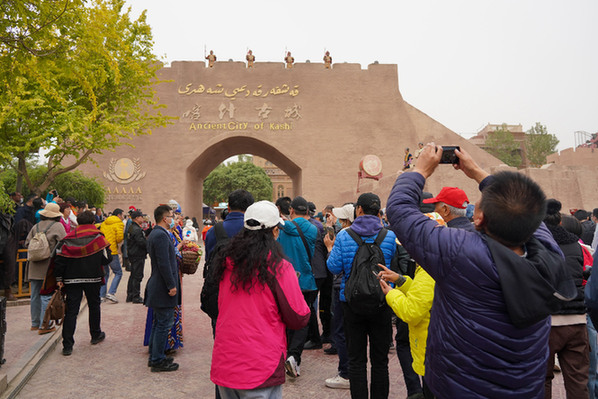 新疆喀什市,游客在開城儀式后進入古城景區(qū)。記者 丁磊 攝