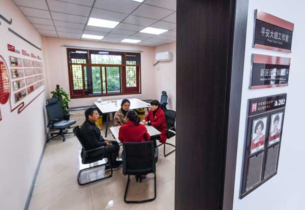 在浙江省湖州市織里鎮(zhèn)社會治理綜合服務(wù)中心調(diào)解室,“平安大姐”工作室的志愿者對一起糾紛進(jìn)行調(diào)解(2019年11月29日攝)。新華社記者 徐昱 攝