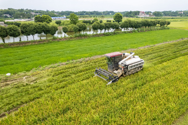 7月4日,在長(zhǎng)沙市望城區(qū)茶亭鎮(zhèn)蘇蓼村,收割機(jī)在收割早稻。
