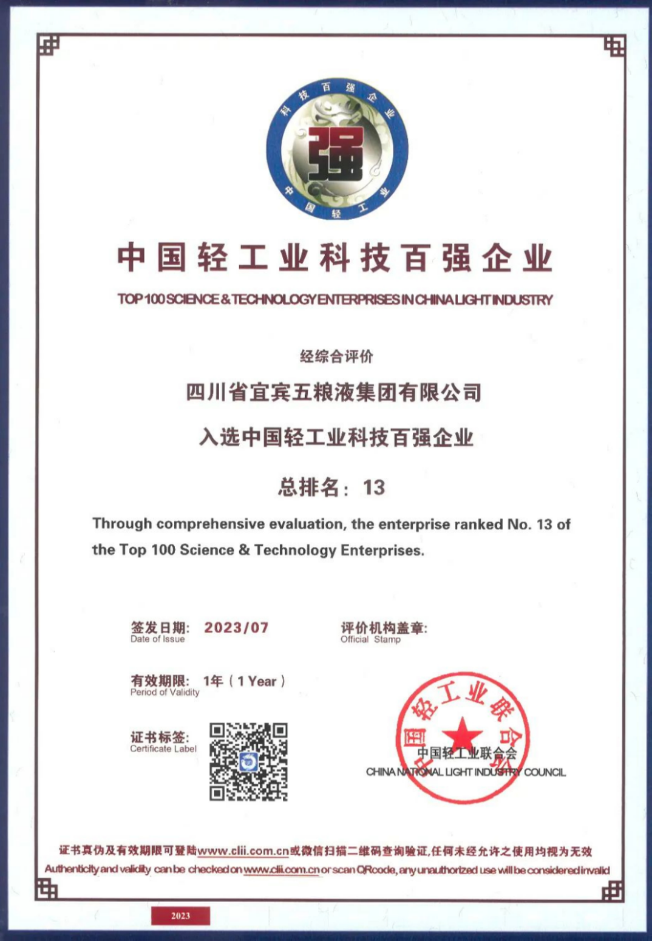 新華財經(jīng)北京7月21日電(李耀威)7月20日,2023年中國輕工業(yè)百強(qiáng)企業(yè)高峰論壇在北京舉行,論壇上發(fā)布了2022年度“中國輕工業(yè)二百強(qiáng)企業(yè)”“中國輕工業(yè)科技百強(qiáng)企業(yè)”“中國輕工業(yè)食品行業(yè)五十強(qiáng)企業(yè)”“輕工裝備制造五十強(qiáng)企業(yè)”名單。五糧液集團(tuán)以酒類行業(yè)最高分名列前茅,位居“中國輕工業(yè)食品行業(yè)五十強(qiáng)企業(yè)”首位、“中國輕工業(yè)二百強(qiáng)企業(yè)”第四位、“中國輕工業(yè)科技百強(qiáng)企業(yè)”第十三位。