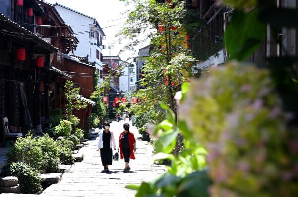 7月25日,游客在陜西省漢中市留壩縣城老街上游玩,老街上分布著多家民宿。