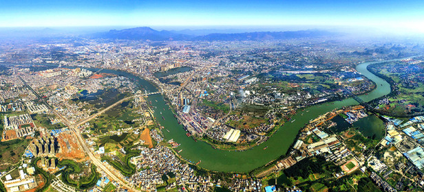 圖為西江黃金水道上的廣西貴港市全景。資料照片