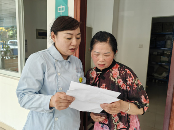 在成都回龍社區(qū)日間照料中心,成都八院護(hù)士喬雪蓮在給社區(qū)老人看體檢單?! ∮浾摺《〖t 攝