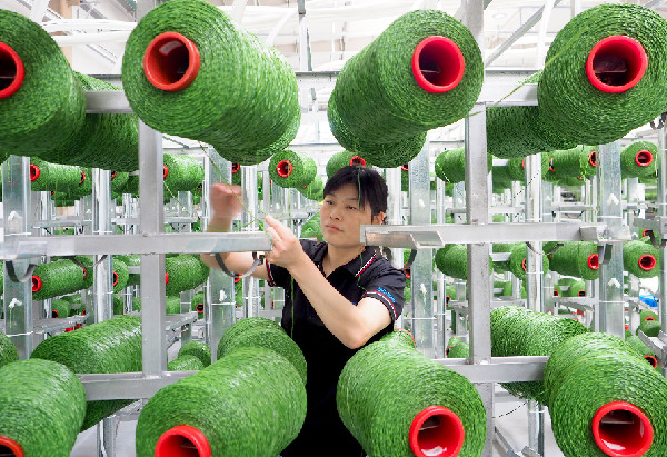 在山東省樂陵市泰山體育產(chǎn)業(yè)集團(tuán)有限公司,工人在人造草坪智能化生產(chǎn)車間作業(yè)。