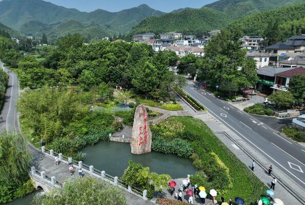 游客在浙江安吉余村村參觀(2023年8月11日攝,無人機照片)。新華社記者 翁忻旸 攝