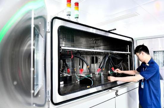 6月6日,在棗莊市國家鋰電池產(chǎn)品質(zhì)量檢驗(yàn)檢測(cè)中心,工作人員對(duì)鋰電池進(jìn)行檢驗(yàn)。 新華社記者 郭緒雷 攝
