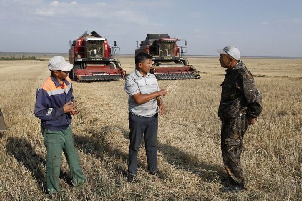 2022年9月2日,在哈薩克斯坦北哈薩克斯坦州,與愛菊集團合作的農(nóng)場主在收割。新華社發(fā)(奧斯帕諾夫攝)