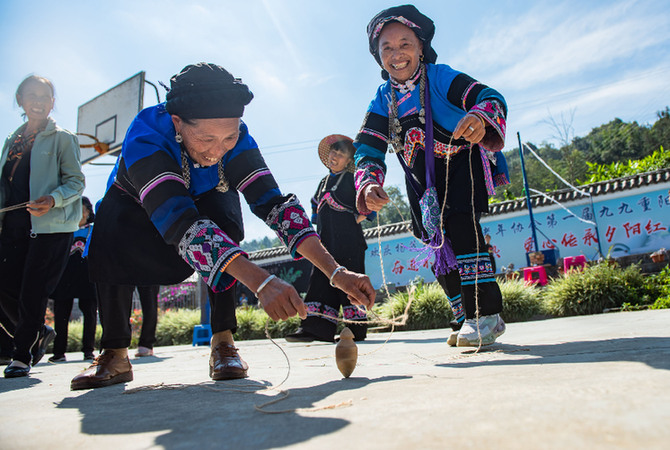 10月22日,云南省文山壯族苗族自治州馬關縣木廠鎮(zhèn)楊茂松村村民在重陽節(jié)活動中打陀螺。