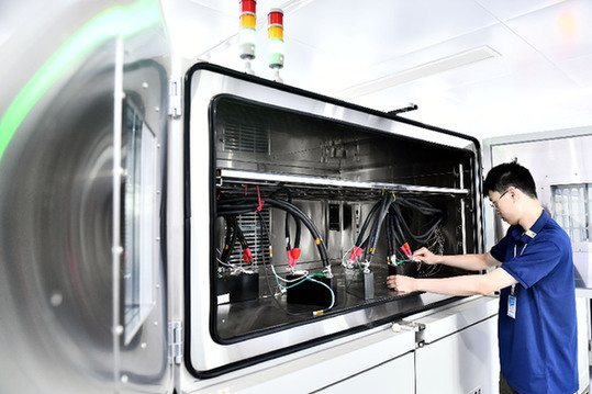 在棗莊市國家鋰電池產(chǎn)品質(zhì)量檢驗檢測中心,工作人員對鋰電池進行檢驗。資料照片