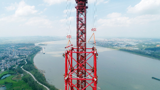 在湖北黃石陽新縣,國網湖北電力員工正在組立武漢—南昌1000千伏特高壓工程長江大跨越段南岸跨越塔。鄒小民 攝