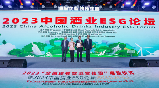 11月24日,2023“全國(guó)理性飲酒宣傳周”啟動(dòng)儀式暨2023中國(guó)酒業(yè)ESG論壇在北京舉行。作為“2023年酒與社會(huì)責(zé)任促進(jìn)工作委員會(huì)”當(dāng)值理事長(zhǎng)單位,五糧液向全社會(huì)倡導(dǎo)健康、理性、適度飲酒,助推酒業(yè)持續(xù)、科學(xué)、健康、和諧發(fā)展?;顒?dòng)期間中國(guó)酒業(yè)ESG論壇發(fā)布2022年度“中國(guó)酒業(yè)ESG年度優(yōu)秀案例”,五糧液憑借在履行社會(huì)責(zé)任和踐行ESG理念等方面的先進(jìn)經(jīng)驗(yàn)與做法,獲評(píng)“2022年度社會(huì)責(zé)任典范”案例。