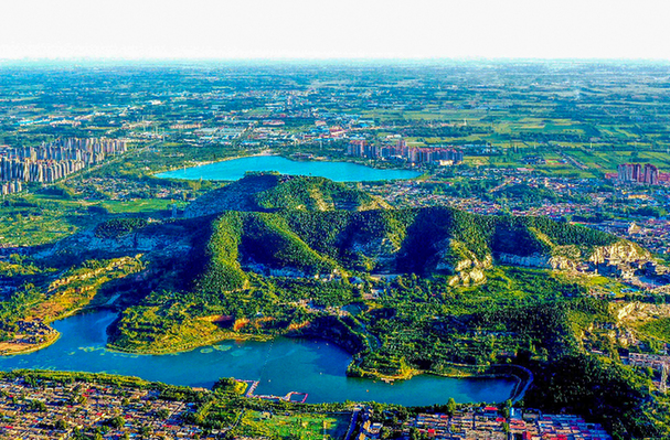 從水泊梁山風景區(qū)上空俯瞰梁山縣城周邊全貌