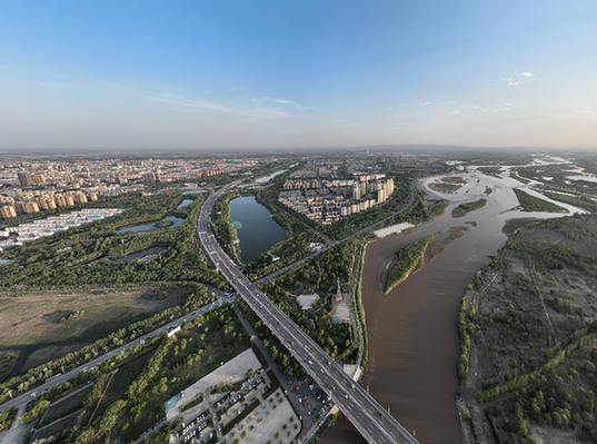 黃河從吳忠穿城而過,從空中俯瞰,黃河、高速、民居融為一體。(受訪者供圖)