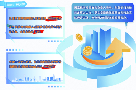 繼續(xù)對小規(guī)模納稅人減免增值稅、優(yōu)化研發(fā)費(fèi)用加計(jì)扣除政策、先進(jìn)制造企業(yè)增值稅加計(jì)抵減……今年以來,相關(guān)部門分批次延續(xù)、優(yōu)化和完善近70項(xiàng)稅費(fèi)優(yōu)惠政策,有力激發(fā)經(jīng)營主體活力,提升創(chuàng)新發(fā)展動能。國家稅務(wù)總局最新數(shù)據(jù)顯示,今年1至10月份,全國新增減稅降費(fèi)及退稅緩費(fèi)16607億元,其中民營經(jīng)濟(jì)納稅人成稅費(fèi)優(yōu)惠政策主要受益對象,金額占比近75%;創(chuàng)新主體受益明顯,前三季度提前享受研發(fā)費(fèi)用加計(jì)扣除政策的企業(yè)達(dá)40.3萬戶。