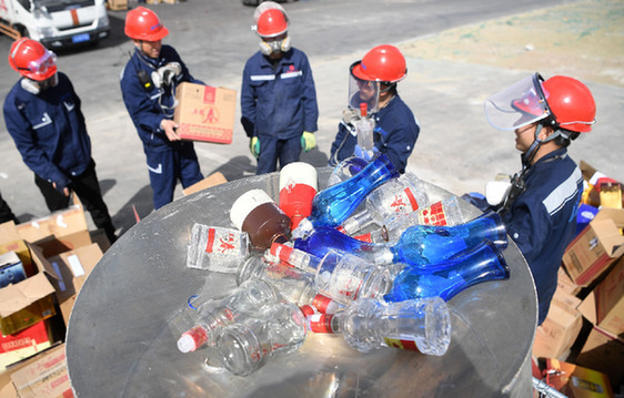 工作人員在對(duì)假冒白酒進(jìn)行無害化銷毀。資料照片