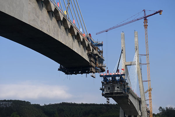 圖為在廣西南寧南深高鐵南玉段六律邕江特大橋建設現(xiàn)場,中鐵十四局集團工人在建設施工中。新華社記者 陸波岸 攝