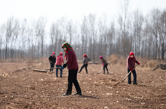 3月7日,青海省海東市民和回族土族自治縣中川鄉(xiāng)光明村村民張存蘭(前)在平整土地準(zhǔn)備播種。 記者 張龍 攝
