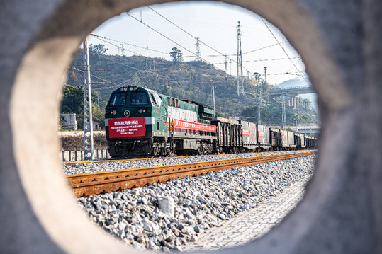 中老鐵路首趟保稅進(jìn)口糧食直達(dá)專列駛?cè)胫貞c萬州新田港站。記者 唐奕 攝