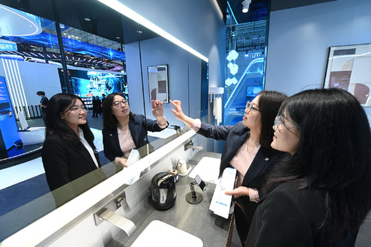 在第六屆數(shù)字中國建設(shè)成果展覽會上,參觀者現(xiàn)場了解一款衛(wèi)浴智能產(chǎn)品。記者 林善傳 攝