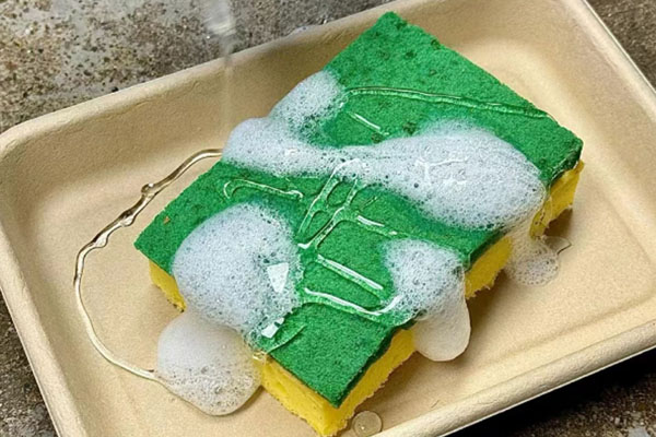 淋上“洗潔精”,“百潔布”在餐盤上抹上一圈后,被店員放入口中食用……這樣的獵奇視頻在短視頻平臺(tái)上大量傳播。不少人紛紛感慨評(píng)論道:“起猛了,百潔布也能吃?”其實(shí),視頻里的“百潔布”是一款造型獨(dú)特的蛋糕食品,并配以糖漿做的“洗潔精”、奶泡做的“泡沫”,以達(dá)到獨(dú)特的視覺(jué)效果。