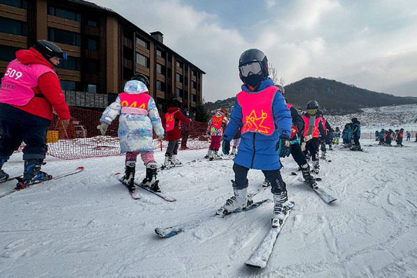 2023年12月5日,在吉林省吉林市萬科松花湖度假區(qū),小朋友們在教練的指導(dǎo)下練習(xí)滑雪動作。 記者 許暢 攝