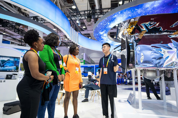 5月31日,參展商(右一)在博覽會上向觀眾介紹“天都一號”通導(dǎo)技術(shù)試驗衛(wèi)星。記者 陳思汗 攝