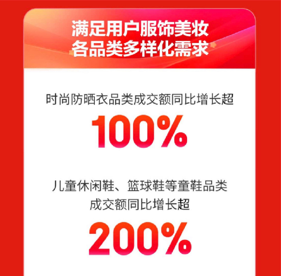 值得一提的是,京東618開(kāi)門(mén)紅契合熱門(mén)消費(fèi)節(jié)點(diǎn),也帶動(dòng)相關(guān)品類(lèi)迎來(lái)了銷(xiāo)量小高峰。隨著“六一”國(guó)際兒童節(jié)來(lái)臨,童裝童鞋品類(lèi)順勢(shì)爆發(fā),耐克(NIKE)兒童成交額同比增長(zhǎng)超5倍。兒童休閑鞋、籃球鞋等童鞋品類(lèi)成交額同比增長(zhǎng)超200%;而滿(mǎn)足消費(fèi)者夏日穿衣怕熱怕曬需求,時(shí)尚防曬衣品類(lèi)成交額同比增長(zhǎng)100%,洞洞鞋成交額同比增長(zhǎng)超100%。又便宜又好的反季品類(lèi)也受到消費(fèi)者追捧,京東618開(kāi)門(mén)紅4小時(shí),皮衣、毛呢等品類(lèi)成交額同比增長(zhǎng)超過(guò)5倍。