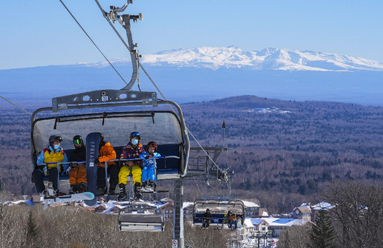 長(zhǎng)白山西坡的萬(wàn)達(dá)滑雪度假區(qū)內(nèi),雪友乘坐纜車(chē)上山?!∮浾摺≡S暢 攝